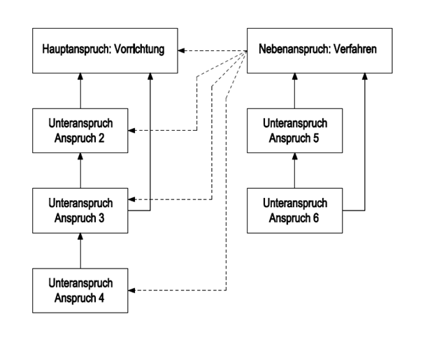 Die folgende Abb. 2 stellt ebenfalls eine typische Struktur eines Anspruchssatzes dar, wobei der Nebenanspruch einen Rückbezug auf die vorhergehenden Ansprüche der anderen Anspruchskategorie aufweist und damit die Merkmale der Ansprüche 1 bis 4 inkludiert.[6]